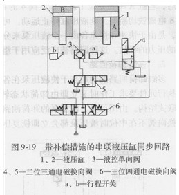圖9-20b回路則用伺服閥直接控制兩個缸的同步動作。用伺服閥的同路同步精度高,價(jià)格昂貴。也可用比例閻代替伺服閥,使之價(jià)格降低,但同步精度也相應(yīng)降低。