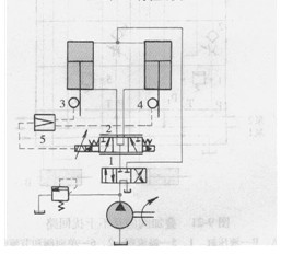 圖9 -20a所示同步回路利用電液伺服閥2接收位移傳感器3和4的反饋信號來保持輸出流量與換向閥1相同,從而實(shí)現(xiàn)兩缸同步運(yùn)動。