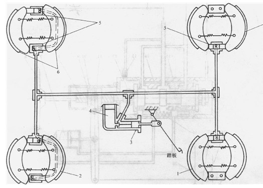1- 后輪制動(dòng)器2一前輪制動(dòng)器3-主缸4-制動(dòng)液杯5-制動(dòng)輪缸6-制動(dòng)蹄
