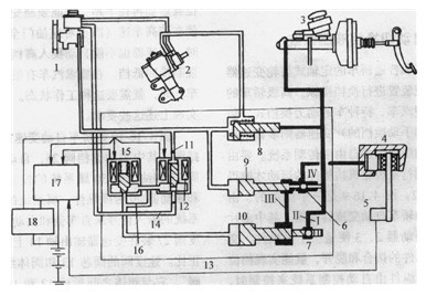 1-動(dòng)力轉(zhuǎn)向葉片泵  2-動(dòng)力轉(zhuǎn)向器  3-制動(dòng)總泵  4-車輪制動(dòng)分泵  5一速度傳感器  6-切斷閥B  7-切斷閥A   8一凋節(jié)活塞  9一旁通話塞  10-減壓活塞11一節(jié)流孔  12-主電磁閥  13-執(zhí)行器  14一節(jié)流孔C  15-副電磁閥  16一節(jié)流孔B   17-防滑制動(dòng)裝置計(jì)算機(jī)18-主繼電器