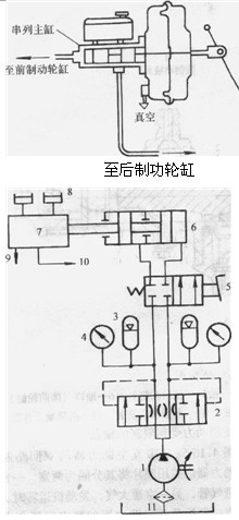 1一空氣壓縮機(jī)2事故切斷閥3一蓄能器4-壓力表s-腳踏制動(dòng)閥6串聯(lián)氣動(dòng)缸7串聯(lián)液壓缸8一蓄液杯9一至前制動(dòng)輪缸10一至后制動(dòng)輪缸11一空氣過濾器