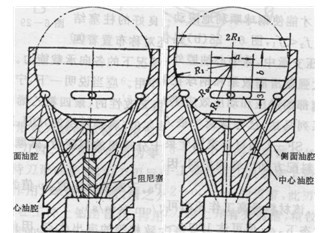 圖1為兩種球塞式內(nèi)曲線液壓馬達的球塞副,它由一個階梯柱塞和一個容納于柱塞大端的鋼球組成。柱塞大、小端直徑之比約為√2。導軌曲面最好能做成適于鋼球滾動的滾道槽。鋼球之所以較大,是為了降低導軌曲面的接觸應力和柱塞球窩處的比壓。切向力由鋼球經(jīng)柱塞大端傳給缸體,所以球塞馬達也屬于柱塞傳力類型。