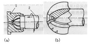 圖2(a)為球形鉸刀鉸削球窩的情形。鉸刀(圖5(b》的切削部分如同一個半圓球頭,上面開有四至六個刀齒。刀齒的前角為零,后角靠手工操作在工具磨床上沿圓弧刃的后刀面修磨出來。為了保持刀形的正確,沿刀刃后面留有0.2 -0.3mm的刃帶,此刃帶在鉸削時還對工件內(nèi)球面有修光作用。球鉸刀有粗、精之分,粗鉸刀刀齒上開有分屑槽,精鉸刀則沒有。加工時,一般都先用鉆頭在工件上鉆出盲孔,再用成形車刀粗車成形,然后粗鉸、精鉸。精鉸時切削速度比粗鉸圓柱孔時的切削速度要低。一般v=5~6m/min。鋼件加工時表面粗糙度為Ra1.6μm。