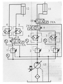圖3 (a)所示為熱封機的液壓系統(tǒng)原理圖。系統(tǒng)的執(zhí)行器為驅(qū)動平臺升降的液壓缸11和驅(qū)動加熱板升降的液壓缸12,用以完成加熱和熱封時的保壓過程。系統(tǒng)的油源為限壓式變量泵13。缸11和缸12的運動方向分別由二位四通電磁換向閥10和8控制;為了在三個油路上獲得獨立的穩(wěn)定壓力,分別用三個減壓閥1、2、3對它們進行調(diào)壓,減壓閥1和2用于設(shè)定加熱時的壓力,減壓閥3用于設(shè)定熱封時的壓力,從而滿足不同工作階段對壓力的需求;缸11的快速上升和慢速接近運動分別采用單向節(jié)流閥6、7進油調(diào)速,并用換向閥9實現(xiàn)兩種速度的換接;由于加熱板行程較短,故采用單向節(jié)流閥4和5雙向出口節(jié)流。