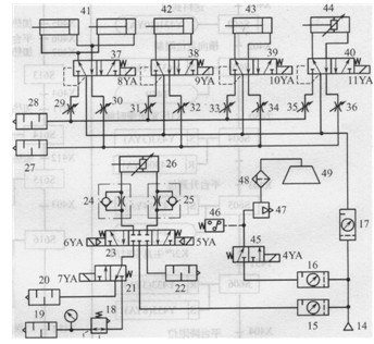 1、2、3-減壓閥;4、5、6、7-單向節(jié)流閥;8、9、10-=位四通電磁換向閥; 11-平臺升降液壓缸;12 -加熱板升降液壓缸;13 -變量葉片泵;14-氣源; 15、16、17 -氣源三聯(lián)件;18 -溢流減壓閥;19、20、22、27、28-消聲器; 21、45-二位三通電磁換向閥;23-三位六通電磁氣控換向閥;24、25-單向節(jié)流閥; 26-加熱板進退汽缸;29、30、31、32、33、34、35、36-節(jié)流閥; 37、38、39、40-二位五通電磁換向閥41-吸盤鉤蓋汽缸42-送料定位汽缸43-橫向定位汽缸;44-夾緊汽缸;46-壓力繼電器;47-真空發(fā)生器;48-空氣過濾器;49-真空吸盤