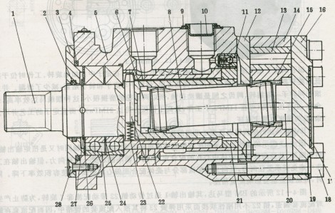 輸出軸1的內端,套在配流套7的孔內,用彈簧23和錐頭銷22帶動配流套7同步旋轉,配流套由墊圈21調整旋轉時的軸向間隙。輸出軸1的內孔中由制有花鍵孔,兩端鼓形花鍵傳動軸8的一端用花鍵插入轉子15的花鍵槽子L中,轉子15的旋轉運動通過花鍵軸8的另一端即軸1的花鍵孔而驅動軸上1的負載,并帶動配流套同步工作?;ㄦI軸8的兩端均設有限位塊6和20,以防止花鍵軸8工作時的軸向移動產生撞擊。