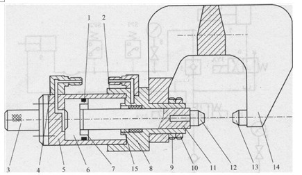 1-Yx型密封圈; 2一壓緊螺母;3-滾花手柄;4管接頭;5-液壓缸缸筒;6-活塞 7-壓環(huán);8-V形密封圈;9-固定螺母;10-缸蓋;11-活塞桿;12-上鉚模; 13-下鉚模;14-弓臂;15-緊固螺母