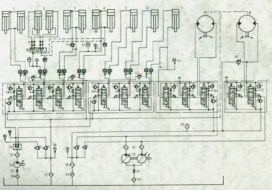 該系統(tǒng)動力裝置由A8V107變量雙泵32和A2F28定量柱塞泵24組成,為系統(tǒng)提供液壓油源。執(zhí)行器由兩個液壓馬達8和7組液壓缸組成。其中,一個液壓馬達8為動力頭提升裝置,它驅(qū)動絞車滾筒,通過鋼絲繩一滑輪組形成倍增傳動,來升降動力頭。另一個液壓馬達8’為動力頭的旋轉(zhuǎn)驅(qū)動裝置,借助行星減速裝置,使動力頭獲得3種速度。使用1臺A2F28液壓泵,通過2組多路閥,分別控制7組液壓缸。為避免干擾,實現(xiàn)同時動作,采用等量分流閥22,構(gòu)成并聯(lián)流量控制回路。列于回程平穩(wěn)性要求較高的翹舉、起架、拉壓等工作回路,采用平衡閥17保證回路工作的平穩(wěn)性;對于同步動作要求較高的夾持器回路,采用雙向等最分流集流閥10,以達到雙缸工作始終保持同步的目的。
