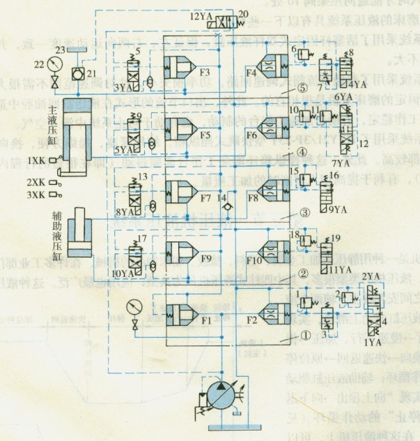 1、2、6、10. 11、15.18一調(diào)壓閥3、7一緩沖閥5、8、9、13. 16. 17. 19、20-二位四通電磁閥4、12-三L四通電磁閥14-單向閥21一液拄單向閩(充液闊)  22-電接點壓力表23-副油箱