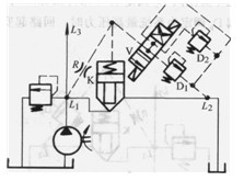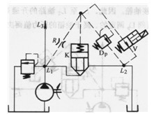 圖3 .4-17中插裝閥K的液阻橋路在L1、L2間形成順序回路。插裝閥K的L2端連向液壓系統(tǒng)的一個(gè)用油點(diǎn),而不是接油箱。橋臂上的先導(dǎo)溢流閥Dp接油箱。因此,Li至L2油路的開(kāi)通是由先導(dǎo)溢流閥Dp調(diào)定的、高于油箱的壓力值而決定的。