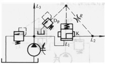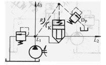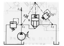圖3. 4-18中插裝閥K液阻橋路在L1、L2形成減壓回路。在此回路中插裝閥K為常開(kāi)式。L2點(diǎn)的壓力為減壓后的壓力,此壓力由先導(dǎo)溢流閥Dp調(diào)定。先導(dǎo)液阻R為插裝閥K閥心的連續(xù)變化提供條件。