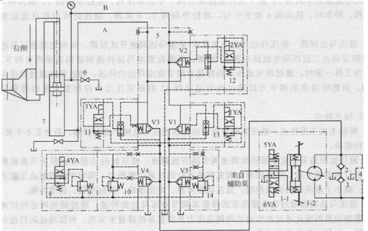 4-保持主泵零偏心和靜壓力的專用闊組合裝置;5-插裝閥集成塊;6一敞氣截止閥; 7液壓缸;8、11、12、13二位四通電磁換向閥;9、10、14-調(diào)壓閥