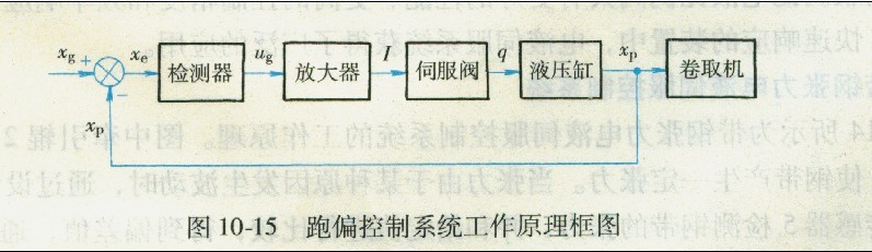 卷取機跑偏控制系統(tǒng)是邊緣位置控制系統(tǒng),其功能是使卷筒自動跟蹤帶鋼邊緣的跑偏,實現(xiàn)整卷鋼卷邊部的自動卷齊,卷齊精度在±1~ 2rmn。光電檢測器支架裝在卷取機移動部件上,屬于直接位置反饋(單位反饋),該跑偏控制系統(tǒng)工作原理框圖如圖10 -15所示。圖中Xg為帶鋼跑偏位移.XP為卷筒跟蹤位移,Xe為偏差位移口