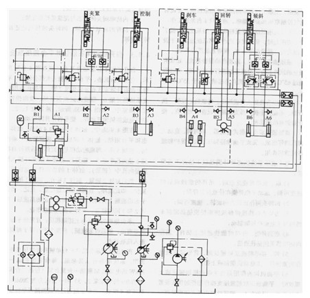 系統(tǒng)中各執(zhí)行回路設(shè)計(jì)為并聯(lián)回路,各回路單獨(dú)或并列間歇動作,又互相不干涉。另外操縱、剎車、平衡和背鉗夾緊各回路都用減壓閥降壓。由此,系統(tǒng)主壓力取決于傾臂液壓缸的推力,并以此作為限壓式變量柱塞泵的壓力設(shè)定值,有效地降低了系統(tǒng)的能量消耗,減少油溫升高。