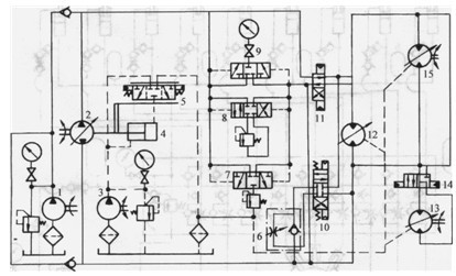 10、11-氣動換向閥12、13、15 -變量液壓馬達(dá)14-液壓閥