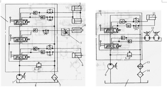 液壓操縱系統(tǒng)為兩個獨立的開式液壓系統(tǒng),如圖4 .1-12所示。一個系統(tǒng)由齒輪泵1從油箱8吸油向主油路供油,經(jīng)三聯(lián)多路換向閥2,操縱雙作用缸6、單作用缸4、并聯(lián)雙作用缸3,實現(xiàn)收割機割臺升降,切稍器升降,集蔗卡的轉(zhuǎn)向等動作,其中單作用缸4的上升速度由調(diào)速閥5設(shè)定,系統(tǒng)回油路經(jīng)過濾器7回油箱。另一個系統(tǒng)由齒輪泵9從油箱15吸油向主油路供油,經(jīng)雙聯(lián)多路換向閥10.操縱兩個串聯(lián)擺線液壓馬達12,及雙作用缸11,實現(xiàn)切稍及集蔗卡升降的動作。由于多路換向閥為并聯(lián)油路,每組液壓缸和馬達均可獨立操作互不干擾。多路換向閥通往各液壓缸及液壓馬達進出油口處都集成有液控單向閥,組成鎖緊回路,可保證液壓缸及馬達位置固定。同時集成有單向節(jié)流閥,在液壓缸下降時起到緩沖作用。集蔗卡升降液壓缸11進口處串聯(lián)調(diào)速閥,以控制上升、下降速度。系統(tǒng)最大工作壓力由集成在多路換向閥中的安全閥調(diào)定。多路換向閥回油經(jīng)冷卻器13、過濾器14流回油箱。