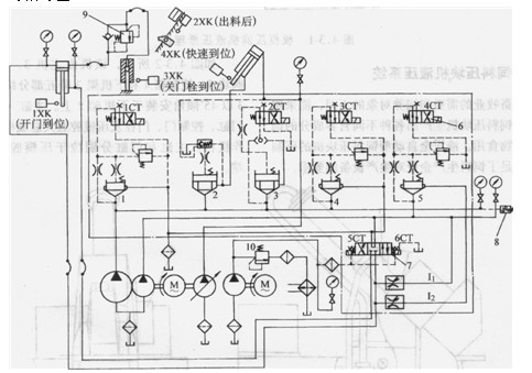 液壓系統(tǒng)原理如圖4.3-3所示。液壓控制系統(tǒng)主要由兩通插裝閥1~5電液閥7和電磁閥6組成。直動式順序閥9及單向閥構(gòu)成門栓柱塞控制回路。10為直動溢閥,8為壓力繼電器。