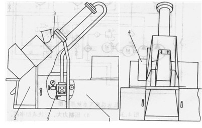 如圖4.3-2所示,該機由主機3、液壓站1、閥塊5、控制箱4和下機架2等五部分組成。主機3以45°傾角安裝于下機架2上。主缸(壓料缸)、門缸、控制門、門栓及壓模腔五大總成構(gòu)成主機工作機構(gòu)。主缸和門缸分別位于壓模腔的上下兩端。