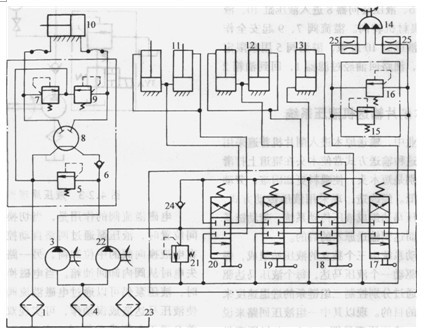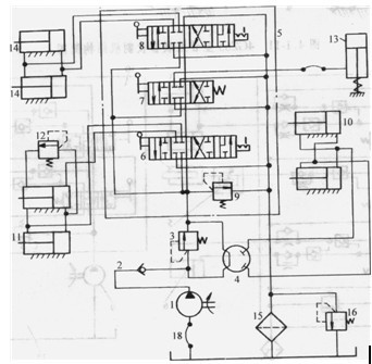 該液壓系統(tǒng)為單泵開式系統(tǒng),由齒輪泵1供油,其理論流量為77L/min,容積效率為0.9,液壓系統(tǒng)壓力為lOMPa。該液壓系統(tǒng)的油路按功能可分為四部分,即: