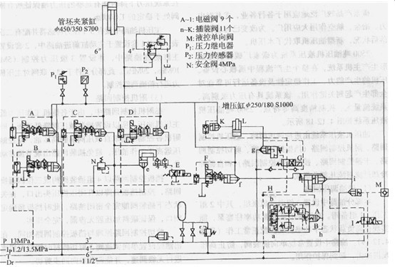 設計最快生產(chǎn)節(jié)奏為27s/根,夾緊缸尺寸Φ450mm/Φ350mm,行程700mm,要求夾緊缸必須快速工作,工作流量2.23×l0^3L/min,故夾緊回路采用了大流量的插裝回路及一臺螺桿泵(1 35×l0^3L/min,1,2/3.5MPa)供油。整個回路的控制壓力為13MPa,供管坯夾緊回路的壓力為13MPa。