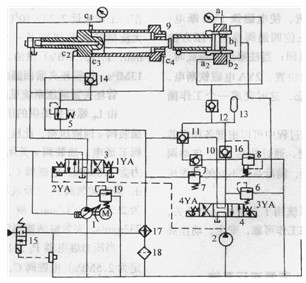 該機液壓系統(tǒng)由變量柱塞泵P1,輔助泵P2,壓力調節(jié)裝置,控制滑動裝置和安全控制系統(tǒng)組成。高壓變量柱塞泵P1的壓力油供壓制柱塞缸使用。而P2泵的壓力油供夾緊缸和作為系統(tǒng)的輔助油。
