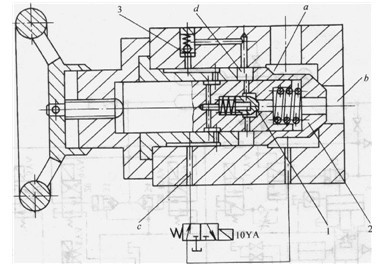 基于壓鑄成型下藝的特殊要求,壓射部分液壓管路的設(shè)計(jì)流速,一般可取25~30m/s,否則液壓管路和元件將變得十分龐大,使整個(gè)壓射機(jī)構(gòu)難于安排。蓄能器按絕熱狀態(tài)計(jì)算。方向閥要滿足快速啟動(dòng)和大流量的要求。第一級(jí)快速壓射閥34是普通插裝閥,第一級(jí)快速壓射閥是一種特殊結(jié)構(gòu)的插裝閥,它允許通過(guò)的壓力油的流量不低于4200L/min,具有快速啟動(dòng)和自動(dòng)關(guān)閉的性能,不需要大的先導(dǎo)閥控制,其結(jié)構(gòu)簡(jiǎn)圖見(jiàn)圖3。閥的a腔與壓射蓄能器22和31相通,b腔接壓射缸的無(wú)桿腔,當(dāng)先導(dǎo)電磁閥10YA動(dòng)作時(shí),c腔回油并向閥l左腔回油,其閥芯打開(kāi),d腔中的油流進(jìn)b腔。于是主閥芯2左移,使a腔接通,進(jìn)行快速壓射??靿荷浣Y(jié)束時(shí),10YA斷電,壓力油進(jìn)入c腔,一路關(guān)閉單向閥,另一路經(jīng)單向閥3進(jìn)入d腔關(guān)閉主閥芯2。