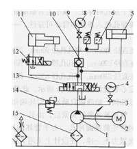 1液壓泵2一電動機3、9壓力表開關(guān)4、8-壓力計5一工作缸