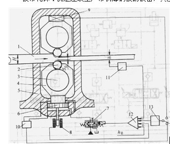 板坯料從旋轉(zhuǎn)著的上、下工作輥2所形成的輥縫中連續(xù)穿過(guò),在軋制力的作用下板帶被軋薄,經(jīng)多道次軋制后可達(dá)到所需成品的厚度。為了軋制薄板帶,工作輥2(與板帶直接接觸的軋輥)的直徑必須減小,但軋制力將使工作輥彎曲變形,為此,在工作輥上下兩側(cè)裝有大直徑的支承輥3以阻止工作輥?zhàn)冃巍T谲堉七^(guò)程中對(duì)軋輥施以軋制力的機(jī)構(gòu)稱為壓下裝置。被軋板帶l從上、下工作輥2所形成的初始輥縫中穿過(guò)。上、下兩組工作輥和支承輥3支持在上、下軸承座4上。上、下軸承座裝在前、后兩側(cè)機(jī)架5內(nèi)(圖示為移去前側(cè)機(jī)架后的示意圖),上軸承座壓在測(cè)壓頭9上,下軸承座的位置由壓下液壓缸6控制。假如軋機(jī)的機(jī)架、軋輥、軸承座等傳力系統(tǒng)都是絕對(duì)剛體,那么由壓下液壓缸調(diào)定的初始輥縫值Su也就是軋制成品的厚度h。實(shí)際上由于被軋鋼板有很大的塑性變形,軋機(jī)傳力系統(tǒng)都是彈性體,因此,在初始輥縫給定條件下,板帶一經(jīng)穿入,整個(gè)傳力的彈性系統(tǒng)就會(huì)變形使輥縫變大,成品厚度h也變大。此外,在軋制過(guò)程中由于板帶坯料厚度和材料變形抗力的變化以及傳力系統(tǒng)幾何形狀的變化(如軋輥的偏心)等因素的影響,也會(huì)使板帶成品厚度發(fā)生變化。為了軋制出等厚度的板帶,壓下液壓缸不僅應(yīng)能調(diào)節(jié)空載時(shí)初始輥縫的大小,而且在軋制過(guò)程中其實(shí)際壓下量還必須隨時(shí)調(diào)整,以補(bǔ)償軋機(jī)傳力系統(tǒng)的彈性變化量(也稱為軋機(jī)的彈跳)的影響。可見(jiàn),板帶軋鋼機(jī)的液壓壓下系統(tǒng)是在軋制過(guò)程中保證板帶沿縱向能有等厚度的自動(dòng)控制系統(tǒng)。壓下液壓缸6由電渡伺服閥7進(jìn)行控制,壓下液壓缸的位移(反映初始輥縫的大小)由位移傳感器8檢測(cè)。軋機(jī)的彈跳量決定于軋制力的大小,為此在軋機(jī)的l軸承座上裝有測(cè)壓頭9,檢測(cè)軋制力的變化,考慮軋機(jī)剛度后即可感受出彈跳量的大小?;蛴脡毫鞲衅?/span>10測(cè)出壓下液壓缸前后壓差的變化,也可感受出彈跳量的大小。板帶出口的實(shí)際厚度h用測(cè)厚儀1l檢測(cè)。將位移傳感器、測(cè)厚儀、測(cè)壓頭(或壓力傳感器)經(jīng)過(guò)剛度調(diào)節(jié)器13處理后的信號(hào)輸入伺服放大器12,其輸出送至電液伺服閥以完成板帶的等厚度控制。其控制方框圖如圖 2所示。測(cè)厚儀測(cè)得的出口板厚h與板厚給定值ho進(jìn)行比較,產(chǎn)生厚度偏差調(diào)節(jié)量,考慮了在彈性傳力系統(tǒng)中板厚和輥縫之間的關(guān)系(用板厚一輥縫系數(shù)表示)后得到初