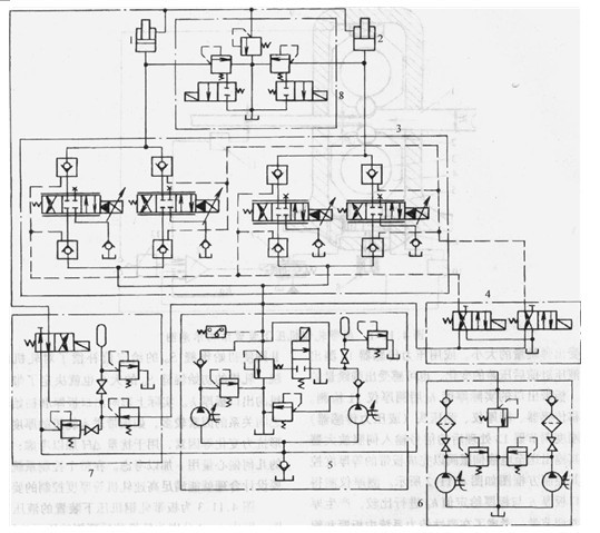 圖 3為板帶軋鋼機(jī)壓下裝置的液壓系統(tǒng)圖。圖中1、2分別為軋機(jī)前后兩側(cè)的壓下液壓缸。液壓缸無(wú)杠腔靠伺服單元3控制。每個(gè)壓下液壓缸由兩個(gè)并聯(lián)電液伺服蒯采用下述方式進(jìn)行控制:在一個(gè)電液伺服閥的控制電路中加入△%的死區(qū);另一則無(wú)死區(qū),這樣,當(dāng)控制信號(hào)小于死區(qū)范圍時(shí)只有一臺(tái)伺服閥工作,系統(tǒng)的增益較小容易穩(wěn)定;當(dāng)控制信號(hào)大于死區(qū)范圍時(shí)兩臺(tái)伺服閥同時(shí)工作,系統(tǒng)增益較大有利于快速調(diào)節(jié)。轉(zhuǎn)換油路單元4可對(duì)四個(gè)電液伺服閥前后的八個(gè)液控單向閥進(jìn)行操縱,可使電液伺服閥從系統(tǒng)中切除或投入。電液伺服閥由高壓油源單元5供油,單元中的蓄能器用以減少供油壓力的波動(dòng)。高壓油源單元在正常工作情況下由低壓油源單元6供油,在單元中有精過(guò)濾器。由于高壓液壓泵吸入的是加壓后的精濾油,這樣就提高了工作可靠性和壽命。壓下液壓缸有桿腔是由回程油路單元7供油,正常工作時(shí)Ff低壓油路單元6直接供油,軋機(jī)的輥縫開(kāi)啟時(shí)經(jīng)減壓后供給較高壓力的液壓油。8為保護(hù)單元,對(duì)壓下液壓缸的有桿腔和無(wú)桿腔進(jìn)行過(guò)載保護(hù)。