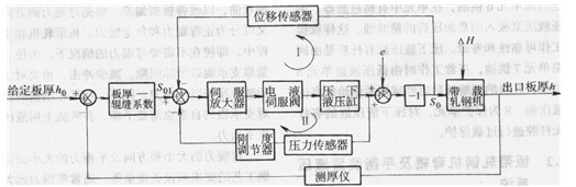 始輥縫的給定調(diào)節(jié)量So1。由伺服放大器、電液伺服閥、壓下液壓缸和位移傳感器所形成的位置控制閉環(huán)I使初始輥縫So的大小能跟蹤給定調(diào)節(jié)量Sol;由伺服放大器、電液伺服閥、壓下液壓缸和壓力傳感器、剛度調(diào)節(jié)器所形成的軋制力反饋閉環(huán)Ⅱ則使初始輥縫So1的給定值補(bǔ)償了對(duì)軋機(jī)的彈跳。軋機(jī)的初始輥縫So的大小也就決定了帶載軋機(jī)的出口板厚h。實(shí)際上影響出口板厚和初始輥縫之間關(guān)系的因素較多,如板帶進(jìn)入軋機(jī)的厚度及變形抗力變化等因素,用干擾量△H加以考慮;軋輥的幾何偏心量用e加以考慮。在整個(gè)控制系統(tǒng)中只要設(shè)計(jì)合理就能滿足高速軋機(jī)等厚度控制的要求。
