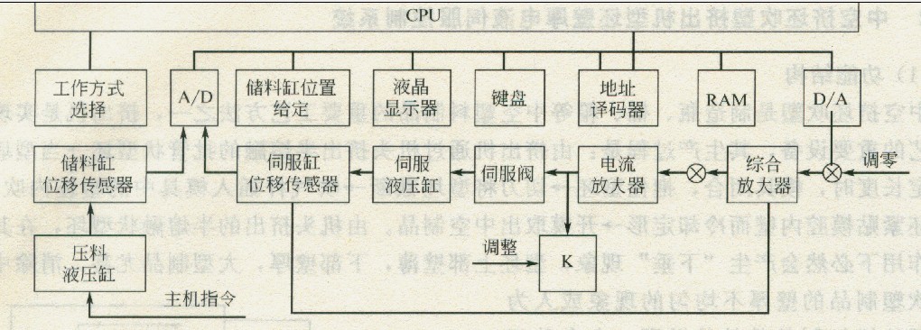系統(tǒng)的油源為定量液壓泵15,泵的壓力油經(jīng)插裝式單向閥12、精過濾器11向伺服閥7供油,系統(tǒng)壓力由溢流閥14設(shè)定并由壓力表10顯示。蓄能器9用于蓄能和吸收壓力脈動以減小泵的排量和穩(wěn)定工作壓力。伺服閥出口油液經(jīng)冷卻器1 7和回油過濾器18回到油箱。停機時,蓄能器通過插裝閥13釋壓。系統(tǒng)的執(zhí)行器為電液伺服閥7控制的液壓缸5,缸的上端設(shè)有位移反饋傳感器6,伺服閥7接受控制器8的指令信號,輸出流量驅(qū)動液壓缸5帶動芯頭3按所需控制規(guī)律運動,機頭出口縫隙S則按此規(guī)律控制型坯的厚度。位移傳感器6感受伺服液壓缸活塞即芯頭3的位移信號,送至控制器中,實現(xiàn)芯頭運動的閉環(huán)控制。以微處理器( CPU)為核心的型坯壁厚控制器是本系統(tǒng)的心臟部分,其原理方塊圖如圖4-25所示,它具有工作方式(收斂式或發(fā)散式等)設(shè)定、系統(tǒng)工作狀態(tài)顯示、工作參數(shù)預(yù)置和輸入、模擬信號處理等功能。