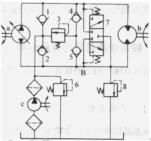 在發(fā)熱量較大的閉式系統(tǒng)中,為改善系統(tǒng)的散熱情況,需增加補(bǔ)油量,故增設(shè)低壓選擇閥(圖中的閥7),使系統(tǒng)經(jīng)常有部分低壓油經(jīng)閥7排回油箱。但此時(shí)輔助泵c的流量應(yīng)是主泵a的流量的20%~30%。
