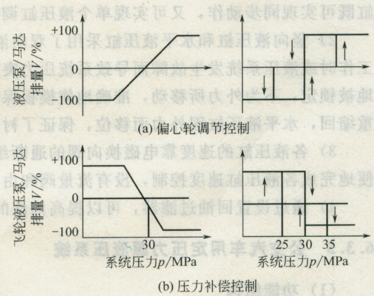 如圖6-23 (a)所示,改變偏心距來調(diào)節(jié)飛輪泵/馬達(dá)5的流量時(shí),流量與壓力成正比變化。采用壓力補(bǔ)償器和蓄能器后,壓力補(bǔ)償調(diào)節(jié)曲線如圖6-23 (b)所示,成反比變化,稱為二次控制( Secondary control)。CPS的壓力補(bǔ)償調(diào)節(jié)有兩種方式,一種是比例控制,稱為A型,另一種為開關(guān)(ON-OFF)控制,稱為B型。B型的蓄能器容量更大,改善了回收效率。同時(shí),B型的飛輪與泵/馬達(dá)3之間有一聯(lián)軸器6,不工作時(shí)(停車、恒速行進(jìn)等),能降低旋轉(zhuǎn)阻力損失,因而使用發(fā)動(dòng)機(jī)的功率可在較大范圍內(nèi)選擇。A、B兩種控制方式的一次和二次控制曲線如圖6-23所示。