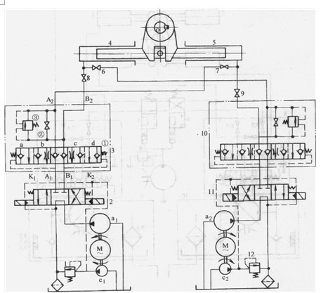 1、12-溢流閥2、11-電液換向閥3、10-限速閥組4、5-液壓缸6、7、8、9一截止閥  a1、a2一泵、cl、c2控制油源