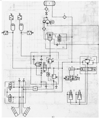 1-油箱2一過濾器3-回油過濾器4-泵組5-舉升控制閥6-氣動控制缸7-舉升液壓缸8-氣動控制閥9-排放閥組IO-轉(zhuǎn)向控制器11-卸荷閥組