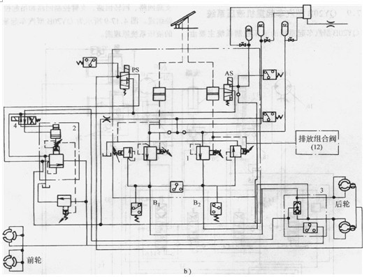 該車有三種制動方式,分別為工作制動、緊急制動和停車制動。制動踏板控制的是工作制動;AS電磁閥動作時為緊急制動。PS動作時,后輪的壓力油被卸荷,由彈簧力驅(qū)動停車制動。