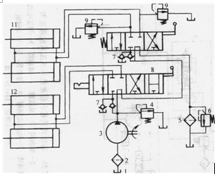 1- 油箱2-過濾器3一液壓泵4一溢流閥5-回油過濾器6-低壓溢流閥7一補油單向閥8一推土控制換向閥9一安全閥10一松土控制換向閥11-松土液壓缸12-推土液壓缸