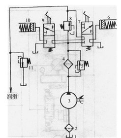 1-油箱2-過濾器3-液壓泵4-過濾器5一旁通閥6右離合器液壓缸7一右轉(zhuǎn)向控制閥8-主溢流閥9-左轉(zhuǎn)向控制閥 10-左離合器液壓缸11-潤滑油溢流閥