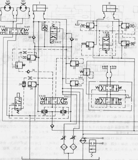 該回路主要由插裝閥30、31及其先導控制閥32、33、34及閥35、36組成。其中閥36可用國產YF型先導式溢流閥改裝而成,即堵死主閥中心的泄油孔,而在先導調壓閥的彈簧腔上開小孔與閥38的閥口相接,其遠程調壓口則與閥37相接。當閥36的外泄油口通油箱時,36可以導通,否則閥36關閉。