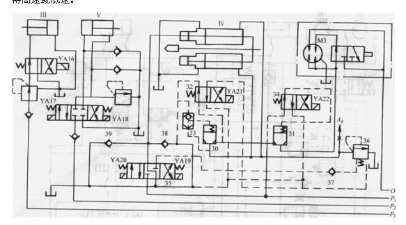 在預塑期間,梭閥33的兩個進油口分別與插裝閥30的進、出油口連接,使30可靠關閉。從而保證壓力油P1全部通過31進人馬達內而不會從閥36溢走。