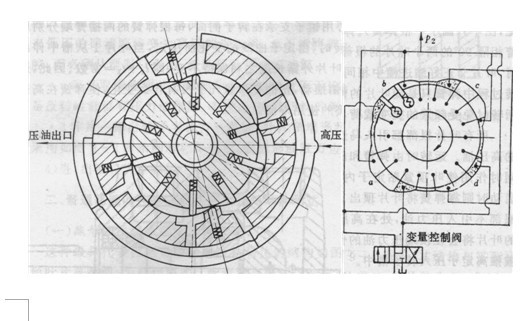 所有葉片根部都引入馬達(dá)進(jìn)口的高壓油。運(yùn)轉(zhuǎn)時(shí)由彈簧和壓力油同時(shí)作用使葉頂緊貼定子內(nèi)表面,啟動(dòng)時(shí)則靠彈簧將葉片頂出。如果,根部不引入壓力油,處在高壓油區(qū)的葉片將會(huì)在頂端壓力油的作用下被推離定子壓入轉(zhuǎn)子槽中。