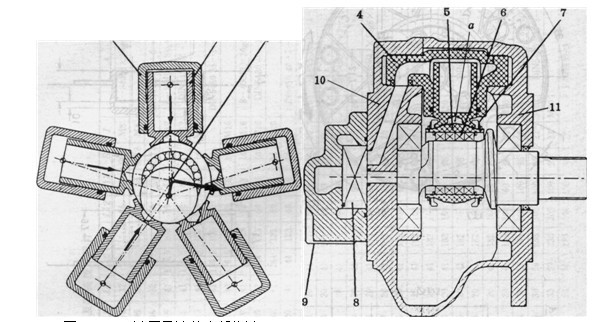 1-擺動缸體;2-柱塞;3-曲軸,4-擺缸耳環(huán)軸;5-球面軸承套;6-滾柱;7-卡環(huán)f8一配流盤;9一配流器(通油盤);10-后殼體;11-前殼體