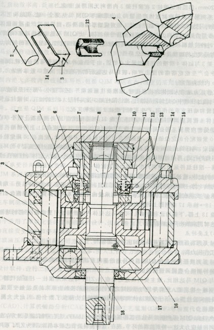 輸出軸9的一端用滾針軸承8支承在與后蓋13連接的配流套10的孔內(nèi),另一端用大的滾動(dòng)軸承17支承在前蓋板16中,軸承17足以承受由穿孔套6內(nèi)的彈簧力對(duì)配流盤11一>缸體4一>墊圈18一>軸承17內(nèi)鋼圈上的軸向推力。