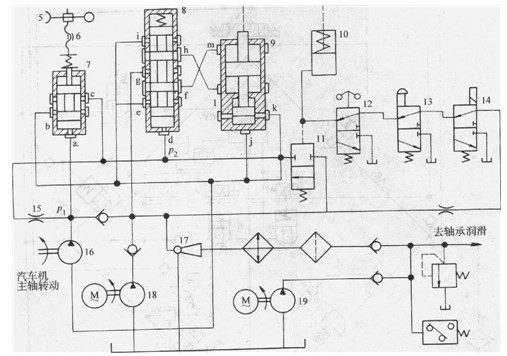 為了可靠地供給主機軸承潤滑而不受電源的影響,普遍采用主軸驅動的泵16來供給工作油,而潤滑油則通過射油器17降壓供給。只有在機組起動或出現事故時,才用手動或通過壓力開關自動開啟備用工作泵18或備用潤滑泵19。