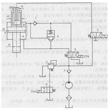 1-定量液壓象.2先導式溢流閥;3、7-單向閥;4二位四通電磁換向閥;5-二位二通電磁換向閥;6-插裝閥; 8-三腔復合液壓缸;9-二位二通電磁換向閥