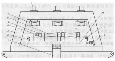 矯直機(jī)由主機(jī)、進(jìn)出料裝置及液壓和電控系統(tǒng)等組成。主機(jī)為框架式結(jié)構(gòu)(見(jiàn)圖4-15),機(jī)架3上方安裝有三個(gè)液壓缸8驅(qū)動(dòng)的矯直輥7。在底座的工作臺(tái)9上對(duì)應(yīng)安裝兩個(gè)與主機(jī)軸線成一定角度的下矯直輥6(由兩個(gè)液壓馬達(dá)4驅(qū)動(dòng))。輥?zhàn)拥哪妇€呈雙曲線形。在工作臺(tái)的兩端部還有兩個(gè)沖頭2和10,分別由兩個(gè)液壓缸驅(qū)動(dòng)。進(jìn)出料裝置分別設(shè)在矯直機(jī)的兩端,進(jìn)料裝置是將需要矯直的管材送人矯直機(jī)中。出料裝置是將矯直后的管材送到物料架中。它們均采用電動(dòng)機(jī)驅(qū)動(dòng)的滾道輸送管材。