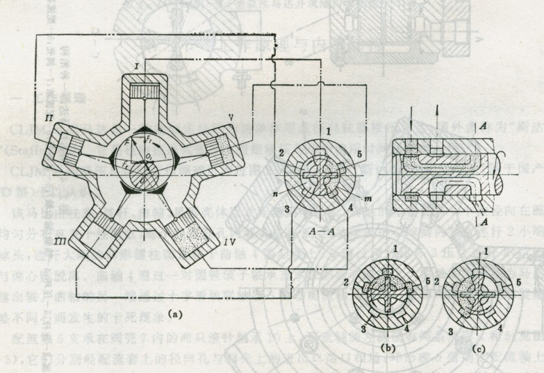 與傳統(tǒng)斯達(dá)法型馬達(dá)外形基本相同。其馬達(dá)的星形殼體4上有徑向布置的五個(gè)柱塞缸孔,每個(gè)缸孔中裝配一個(gè)活塞16,每個(gè)活塞16的球窩中部均鉸接著連桿17的球頭,球頭內(nèi)端的對(duì)開式球頭座18,被卡在活塞槽孔內(nèi)的孔用彈簧擋圈19軸向定位,連桿大頭端的凹形圓弧面剛好與曲軸的曲軸頸吻合,五只連桿大端在曲軸頸的兩側(cè)分別各用一只抱環(huán)5箍牢,使得各缸連桿在回程工作時(shí)不與曲軸頸脫離。