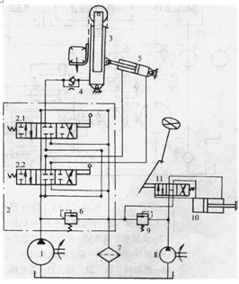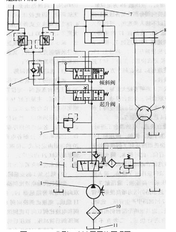 1-操作泵2一控制閥組3-升降液壓缸4單向節(jié)流閥5-傾斜液壓缸6-溢流閥7-回油過濾器8-轉向液壓泵9-轉向系統(tǒng)溢流閥10-助力液壓缸11轉向助力隨動閥