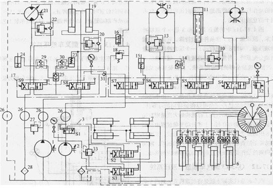11–支臂伸縮缸12-副吊鉤吊起馬達14、29、30-單向節(jié)流閥15-副吊鉤制動液壓缸16-液動閥18、27、32、33-溢流閥19-變幅液壓缸21-主吊鉤馬達