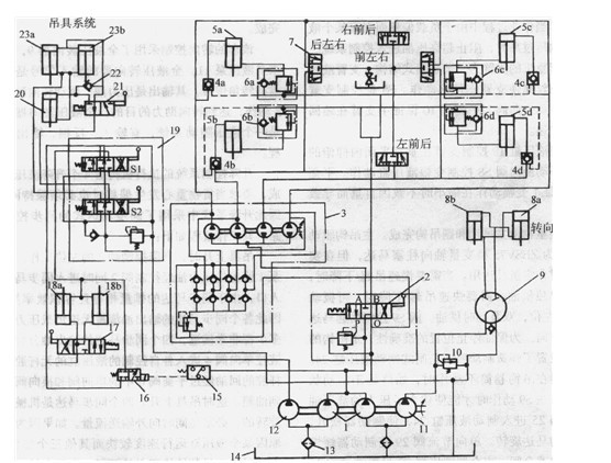 1-大流量泵2—小流量泵3一點腿控制閥4-轉閥5-液壓鎖6-垂直支腿液壓缸  7-支腿水平液壓缸8 17-多路換向閥9-旋轉馬達10、13、20、22-平衡閥